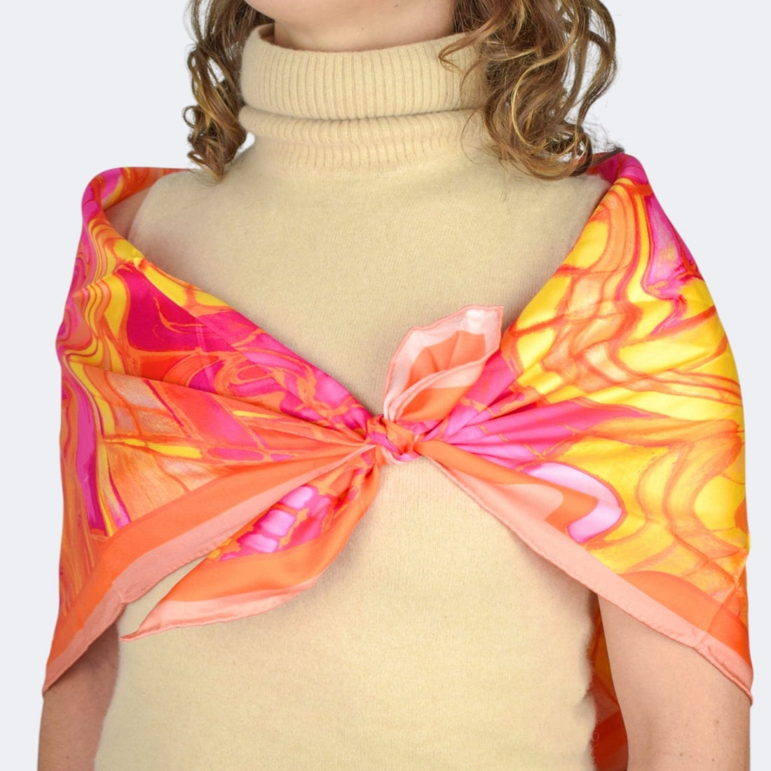 Groovy Rose Carré 90 presenta tonos caléndula, magenta y naranja, destacando un encantador estilo retro...