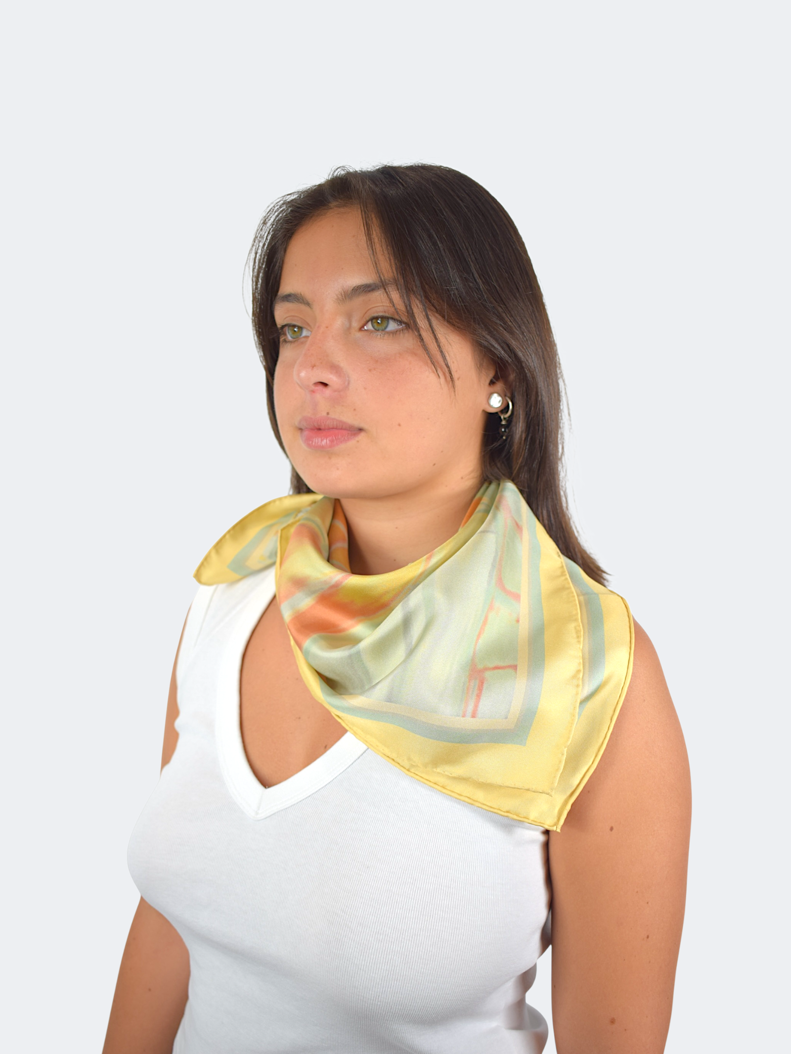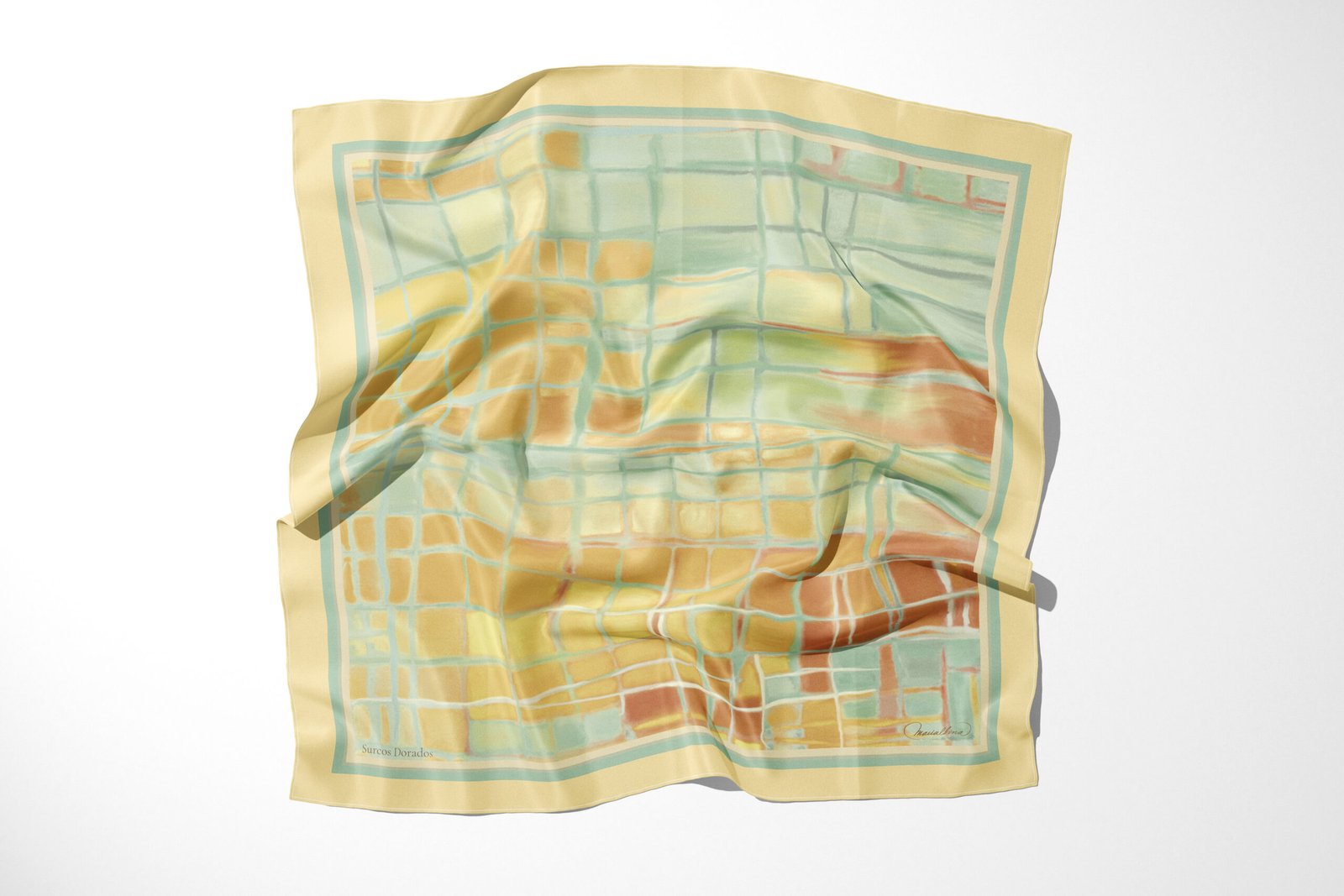Its palette plays with soft golds, buttery yellows, sandy hues, touches of light ochre, and hints of pale mint, creating a sophisticated, diffused light. Each scarf is part of a limited edition of only 16 worldwide, meticulously hand-finished to preserve its artisanal value. Double-sided digital printing ensures the fidelity of every shade, while the 16mm OEKO-TEX certified silk twill offers a soft, flowing, and delicate feel against the skin.