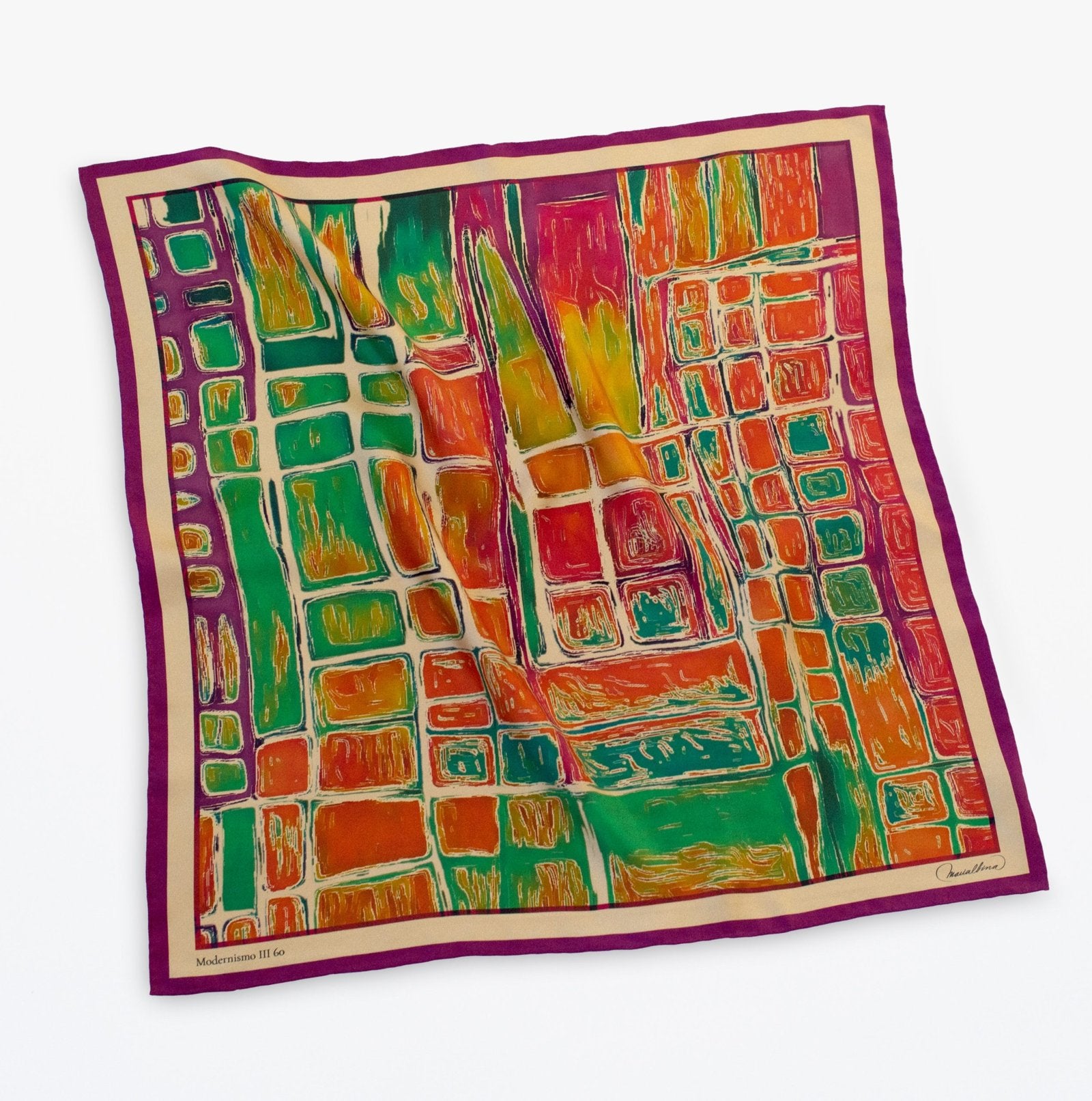 La bandana de seda Modernismo es un accesorio muy hermoso con un vibrante estampado multicolor abstracto inspirado en las ventanas de vidrieras de los edificios modernistas de Barcelona. Es una edición limitada de tan solo 16 piezas en todo el mundo, lo que la hace aún más especial. It is a limited edition of only 16 pieces worldwide, making it even more special.